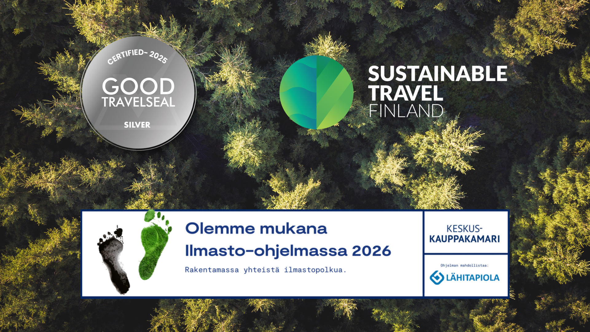 Osoituksena vastuullisuustyöstämme olemme saavuttaneet kotimaisen Visit Finlandin Sustainable Travel Finland -merkin sekä kansainvälisen Good Travel Seal –vastuullisuussertifikaatin. Lisäksi osallistumme Keskuskauppakamarin Ilmasto-ohjelmaan, jonka tavoitteena on edistää hiilijalanjäljen laskentaa pk-yrityksissä ja sitä kautta tukea yrityksiä päästöjen vähentämisessä.